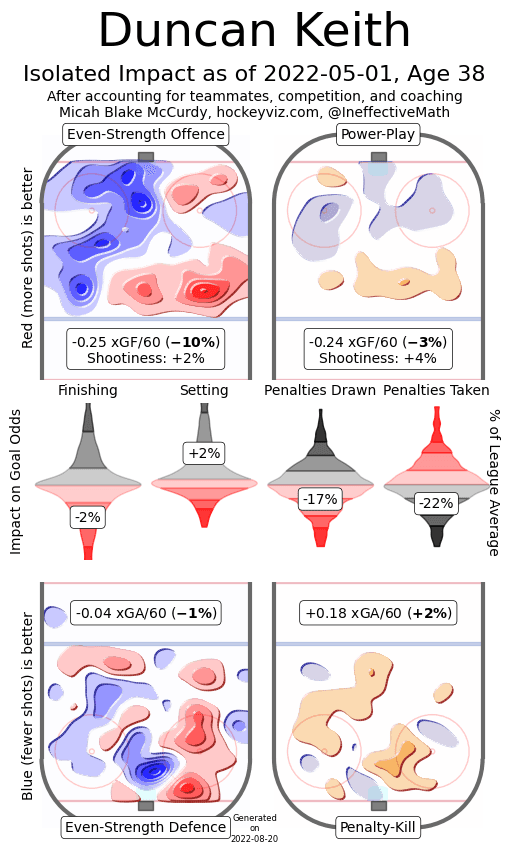 Looking at his isolated impact charts, his offensive contributions were… not great! He definitely benefitted in that sense from having a great puck mover and offensive defenceman in Evan Bouchard with him. Keith’s defensive impacts were slightly above league average, so that’s something you like to see.
