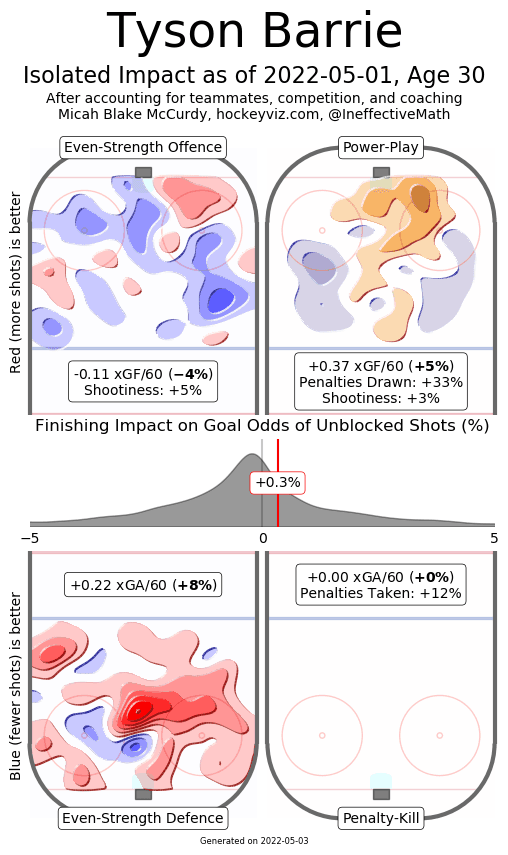 Despite that, his isolated impact charts are… not promising. There’s lot of value in his ability on the powerplay where he provides offence at a five percent rate above league average, but in terms of even-strength play, Barrie is negative in both ends of the ice.