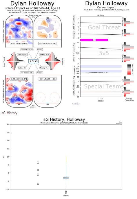 Holloway’s underlying numbers from last year were encouraging. Edmonton controlled the pace of play with him on the ice, and his individual contributions pegged him as a third-to-fourth liner. There’s more than enough room to grow, and I wouldn’t put too much weight into his charts given his limited sample size.