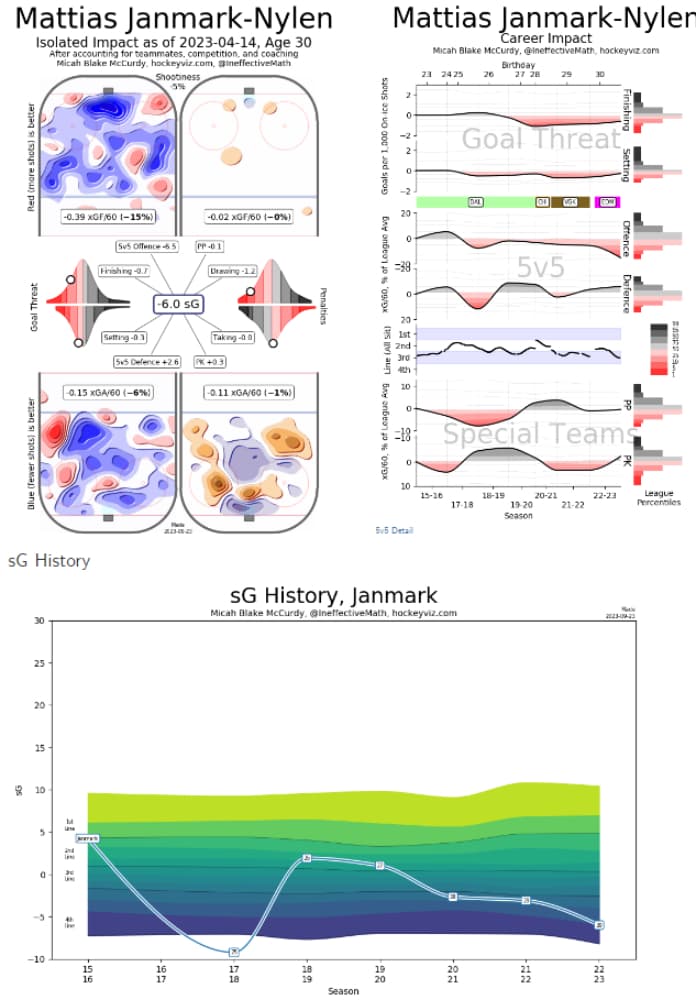 It’s hard to argue with what he did for the team given some of the offence he contributed in a depth role, but if that’s not there, what exactly is Janmark? His individual contributions to the offensive game are few and far between despite being a plus contributor in the defensive zone. He’s a hard-checking winger who can at least help force opposing offence to the outsides. There’s some inherent value in that.