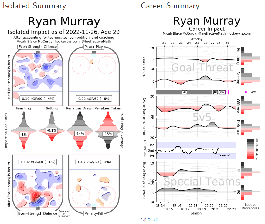 Murray made the team out of camp and during his brief stint, played 63 minutes alongside Evan Bouchard, and 46 minutes alongside Tyson Barrie. He had a few minutes with other Oilers defencemen, too, but these were his primary partners.