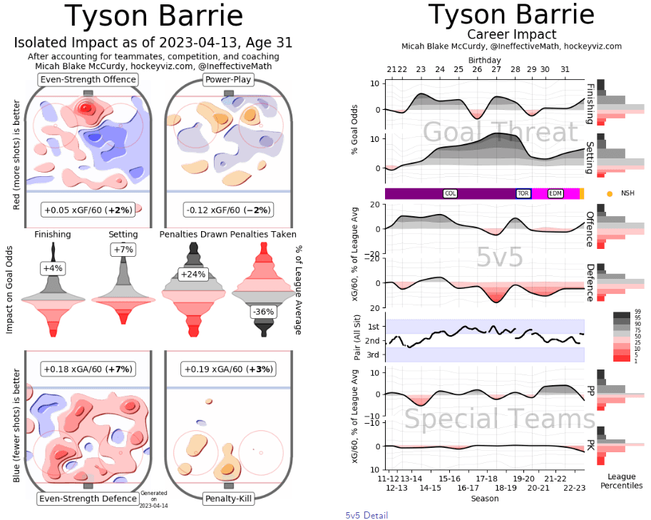 For the Oilers, Barrie always came as advertised. A guy who would struggle defensively at 5×5, but be able to move the puck up the ice and provide plus value on the powerplay. This last year, however, we saw Barrie’s individual powerplay contributions dip below league average despite still providing points there.