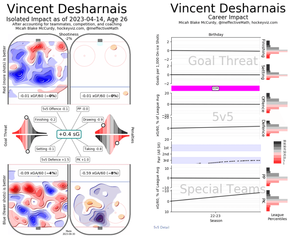 Looking at his underlying numbers above, there was a lot to like. The Oilers were even in terms of shot attempt share, but the club excelled in terms of controlling the goals, expected goals, and scoring chances all the while posting an ideal PDO number. This is a great sign from Desharnais that he was able to post these numbers, doubly so considering the Oilers need him to be a strong defensive player.