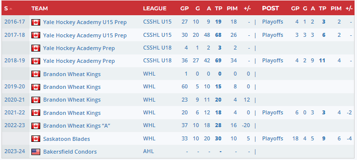 Chiasson’s 2022-23 year was a story of two seasons. One before he was traded from the Brandon Wheat Kings and the other when he arrived with the Saskatoon Blades. To say that his first half was dreadful would be an understatement. His splits were 10-18-28 in 37 games and a paltry -20 on the plus/minus. Yes, plus/minus is a flawed stat, but it is reflective of Chiasson’s struggles. It goes without saying had Chiasson continued at that pace, he likely would have fallen from last year’s ranking.