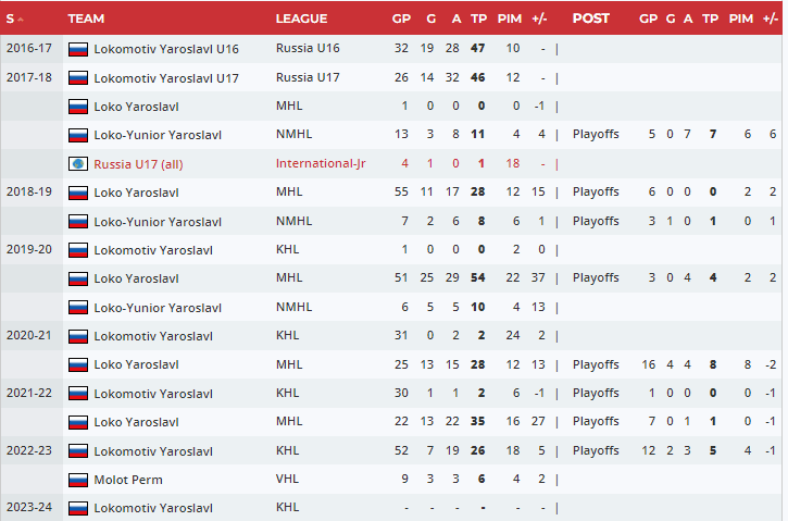 As can be seen from the stats page, he has excellent offensive ability. His 2022-23 season saw him start in the VHL, which is Russia’s version of the AHL. He was called up at the start of October to his KHL team, Lokomotiv Yaroslavl. In 52 games, he went 7-19-26 which placed him 7th on the team.