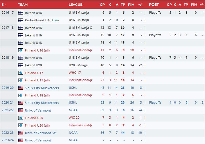 What we will want to see is his point totals accelerate in his third collegiate year at Vermont. While it might be a stretch, approaching a point-per-game plateau would show signs this player has some offensive skill that can translate. What makes me think this is a possibility is his play at the World Juniors in the summer of 2022 where he played top six minutes on a team with Kemmel, Raty, Lambert and Jarventie. He was second on the team in power-play goals over the short tournament. There is offensive skill in this player.