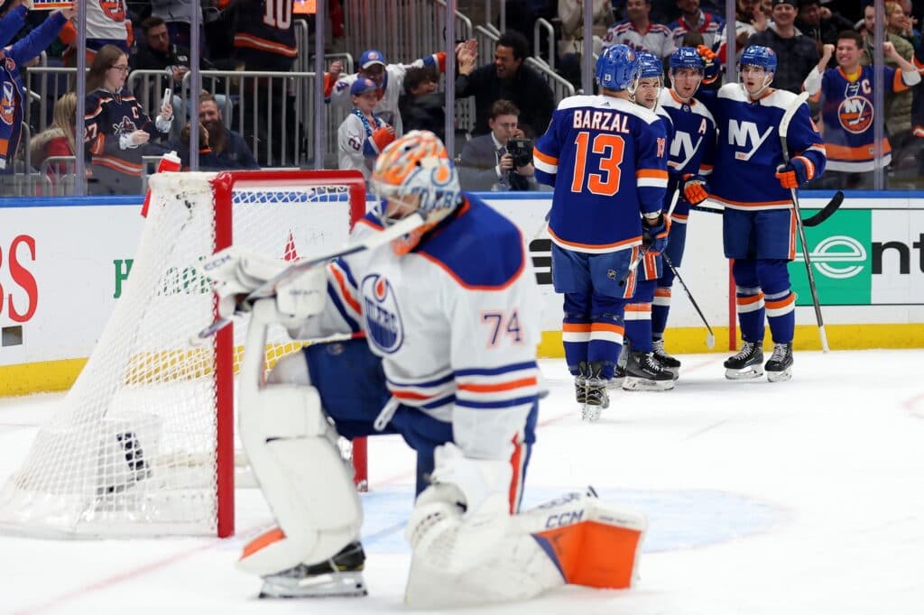Dec 19, 2023; Elmont, New York, USA; New York Islanders center Bo Horvat (14) celebrates his power play goal against Edmonton Oilers goaltender Stuart Skinner (74) with teammates during the second period at UBS Arena. Mandatory Credit: Brad Penner-USA TODAY Sports