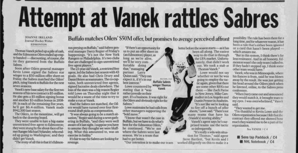 Having missed out on the marquee forwards available during free agent frenzy, Lowe turned his attention to another avenue. The Oilers inked restricted free agent Thomas Vanek, who was coming off of a breakout 43-goal season with the Buffalo Sabres, to a seven-year, $50 million offer sheet. Having just lost a pair of key forwards, Chris Drury and Daniel Briere, in free agency, the Sabres quickly matched Edmonton’s offer.
