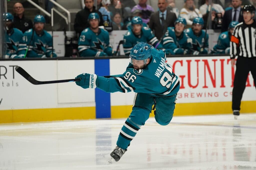 Nov 25, 2024; San Jose, California, USA; San Jose Sharks defenseman Jake Walman (96) takes a shot on goal against the Los Angeles Kings in the second period at SAP Center at San Jose. Mandatory Credit: David Gonzales-Imagn Images