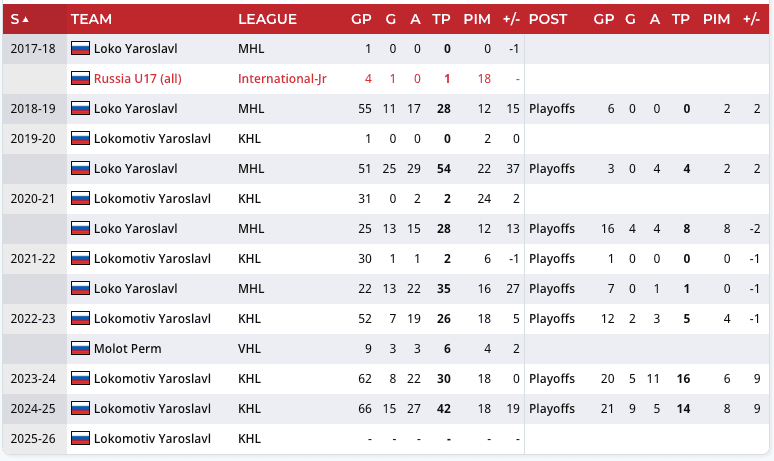 Beryozkin moved into a top-six role with Lokomotiv in 2024-25 and saw his offence take a major step forward. The big winger scored 15 goals and 42 points in 66 regular-season games and followed that up with 14 points in 21 playoff contests, helping Lokomotiv capture its first-ever KHL Gagarin Cup.