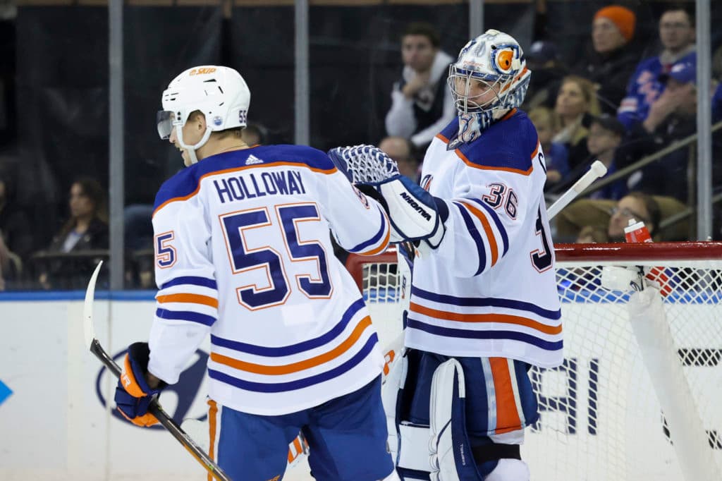 Nov 26, 2022; New York, New York, USA; Edmonton Oilers goaltender Jack Campbell (36) celebrates with Edmonton Oilers left wing Dylan Holloway (55) after Holloway’s goal during the third period against the New York Rangers at Madison Square Garden. Mandatory Credit: Jessica Alcheh-USA TODAY Sports
