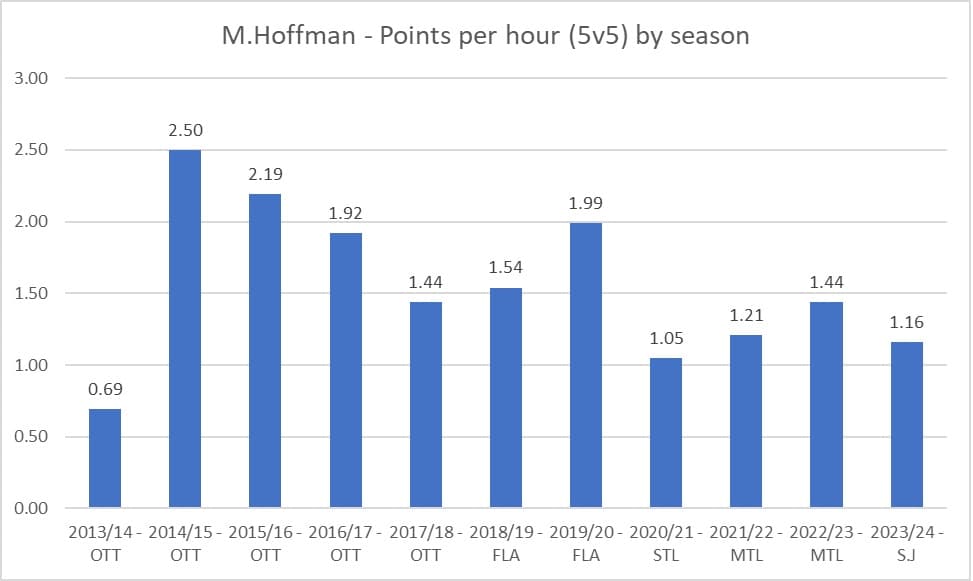 The overall rate of point production (i.e., points per hour) at even-strength has gradually been declining for Hoffman. His high point came as a 24-year old in 2014/15 when he scored at a first-line rate for Ottawa with 2.50 points per hour. While he finished fifth on the Senators in overall points, he was second on the team in even-strength points, just a few points behind Mark Stone. But after a decent season with Florida in 2019/20 when he was 30, things have gone pretty poorly for Hoffman. Even though he’s been getting around the same number of minutes and getting to periodically play with talented players, he’s been producing worse than a third-line rate (1.50).