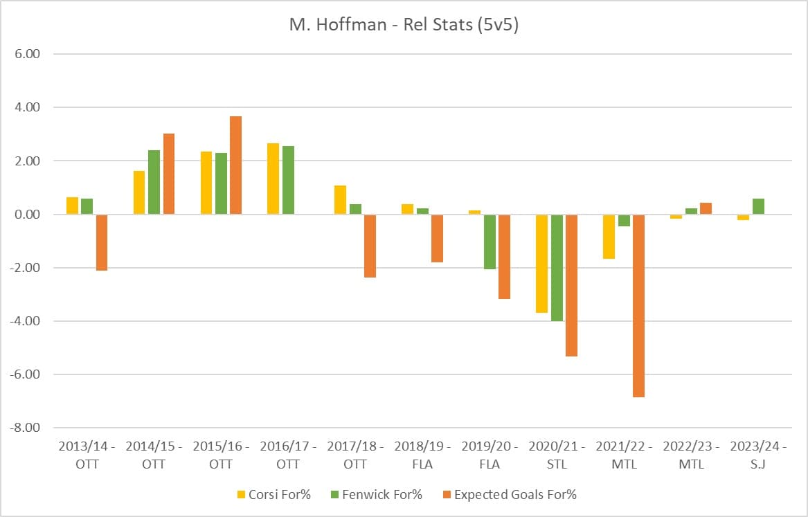 The table below shows Hoffman’s on-ice shot-differential numbers relative to his teammates. This factors in the quality-level of their roster and tells us if they’re thriving in the minutes their given. I tend to use Corsi For percentage, which is a proxy for puck possession, as well as Fenwick and Expected goals as a proxy for scoring chances.