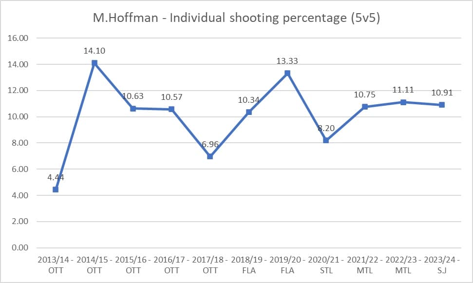 What’s interesting is that while Hoffman’s rate of shots has declined, his personal shooting percentage has remained fairly consistent – definitely a good sign for Edmonton. Over the last three seasons, he’s hovered around 11% and there’s a good chance he’ll be able to post this again. The issue, as indicated above, is that he’s not getting enough chances – an issue that could be mitigated by the coaching staff and their deployment tactics.