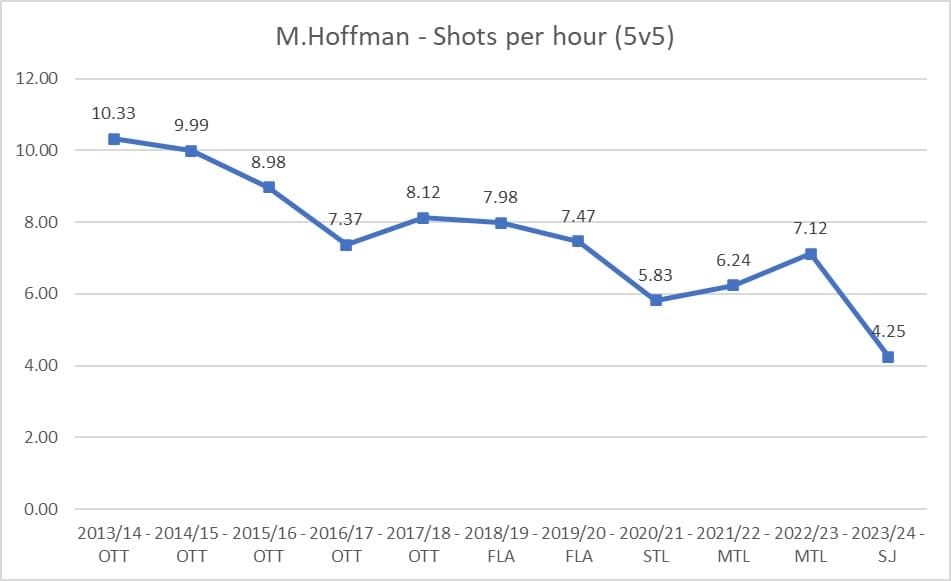 One underlying issue for Hoffman is that his individual rate of shots has been declining for quite some time now. It plateaued between 2016 and 2020, when he was between ages 27 and 30. But then it took another drop after that. Last year was a career low, as he only generated 4.25 shots per hour – well below his career levels and what he’d been posting in the three seasons prior. San Jose was a dreadful team last year and he dealt with injuries, which obviously played a role. But it’s part of an ongoing trend, so it’s likely going to continue unless he’s fully healed up and has high end linemates.