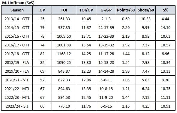 To figure out what the best-case scenario would be for Hoffman in Edmonton, I wanted to get a better understanding of how he’s been utilized by five different organizations as well as his underlying performance numbers, specifically at even-strength (5v5). The PTO agreement is a great way for the Oilers to see what Hoffman has to offer and if he can add any ounce of value to the roster. The bottom six could always use some more scoring ability, so seeing what Hoffman has left is worthwhile.
