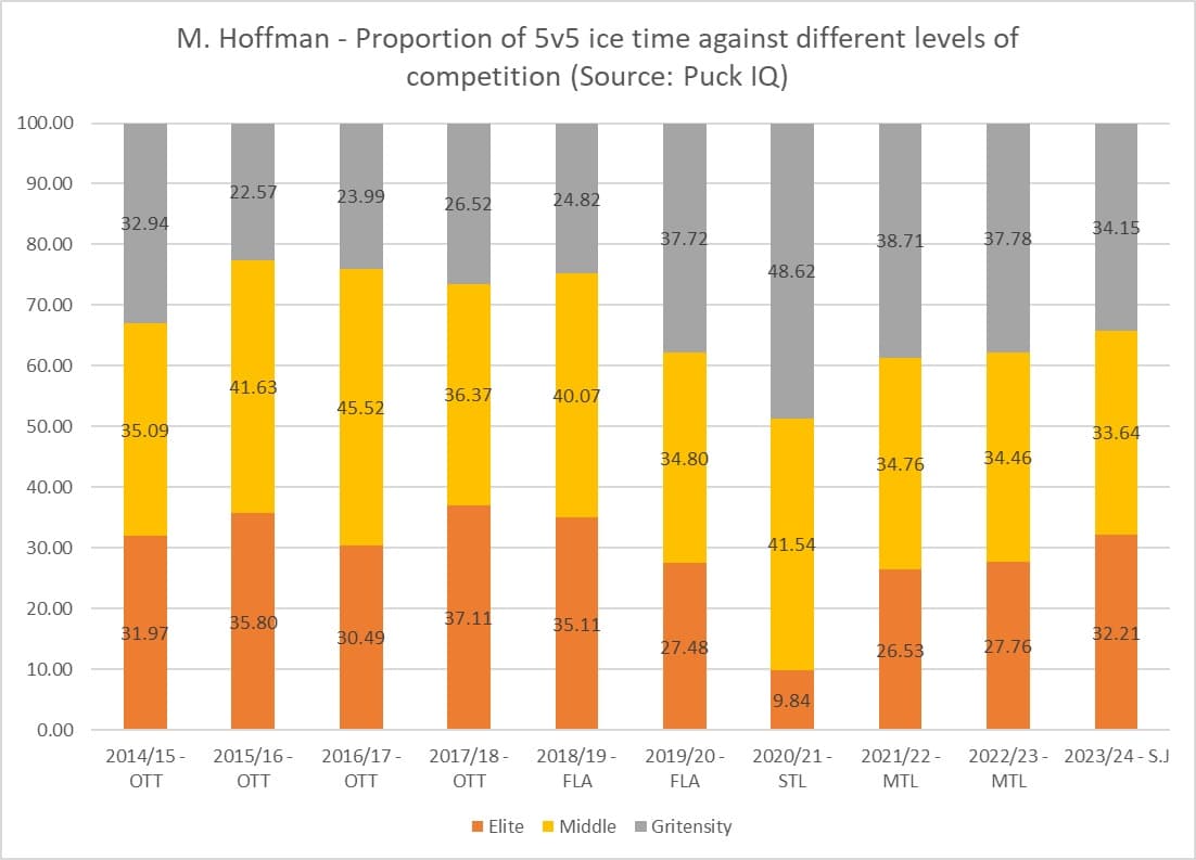 Again, we see that his responsibilities have declined as he’s aged, and there’s been a consistent effort of his coaching staff’s to keep him away from elite level competition. Prior to turning 30, Hoffman was more often deployed with top-six linemates and against elite level players. But over the last few seasons, coaches have kept him further away from top-end players. There was a slight uptick of time against elites last season in San Jose, but that could have been to build up his trade value ahead of the trade deadline as the Sharks were, and continue to be in, a rebuilding phase.