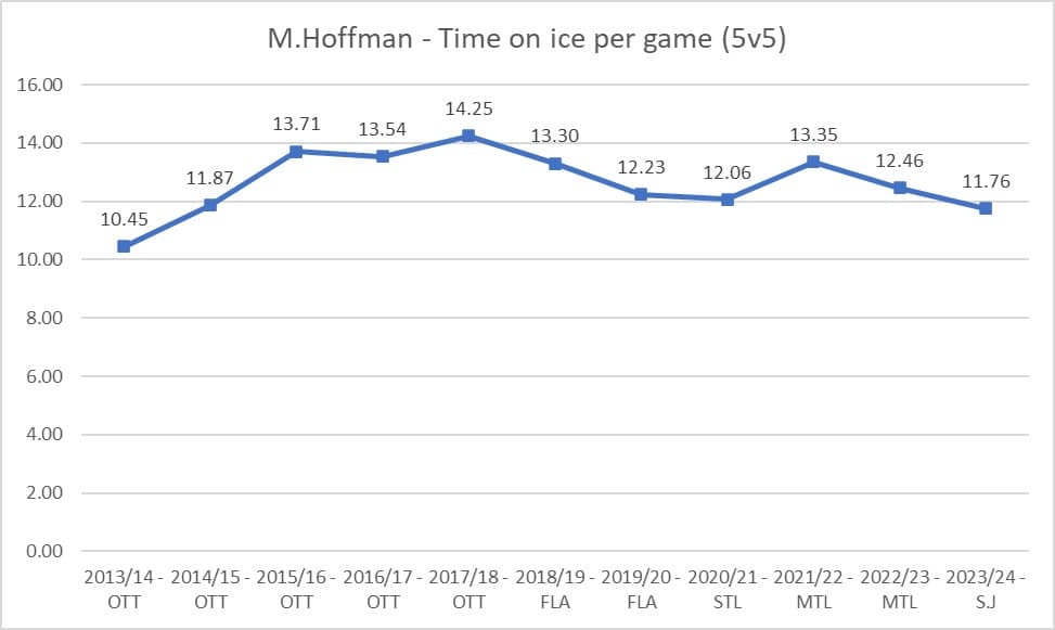 Knowing Hoffman’s history and reputation as a goal-scorer and what we know about player aging curves, it’s a good to know how other NHL coaching staff’s have handled his ice-time and deployment – especially in the last few seasons.