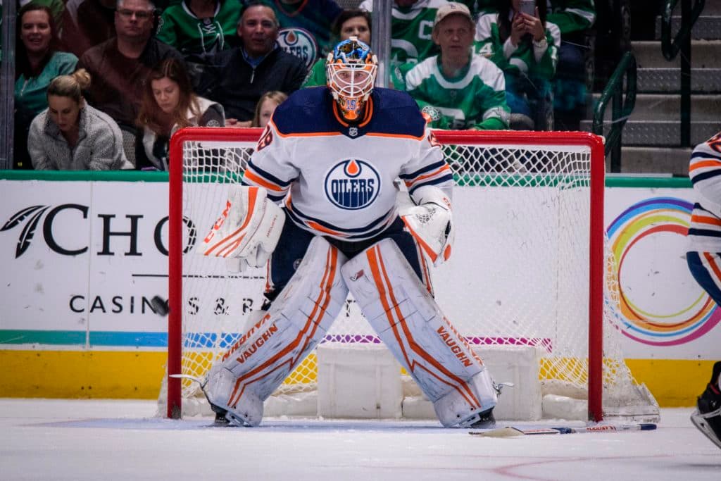 Mar 3, 2020; Dallas, Texas, USA; Edmonton Oilers goaltender Mikko Koskinen (19) in action during the game between the Stars and the Oilers at the American Airlines Center. Mandatory Credit: Jerome Miron-USA TODAY Sports