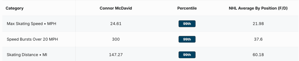 And to add to that, it’s not like you needed further proof of how fast the Oilers’ captain is, but in addition to leading the league in top speed this season, he also leads in two other skating categories: total skating distance at 147.27 miles this season, and speed bursts over 20 MPH, with 300.