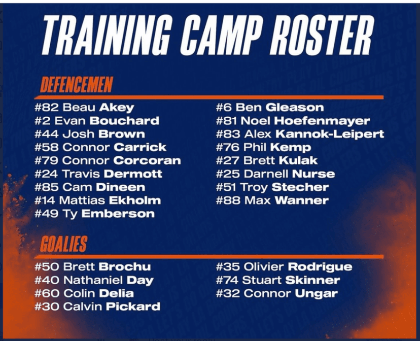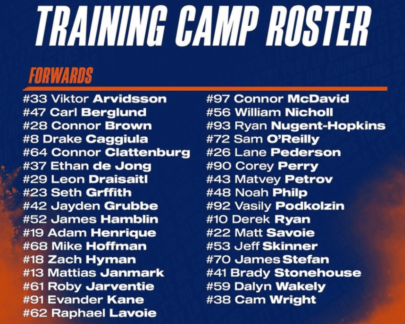 The Oilers first group will hit the ice tomorrow morning at 9:30 a.m. for a 90-minute session with the second group skating at noon, and usually, they will swap time slots on Friday. Here’s the training camp roster.