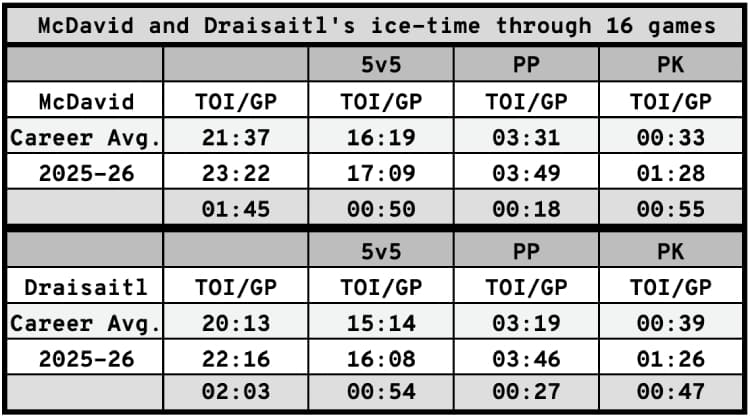 McDavid and Drasiatil’s ice-time is akin to their average numbers in the playoffs, not numbers we should be seeing 16 games into a regular season after two years where the team got to Game 6 and 7 of the Stanley Cup Finals.