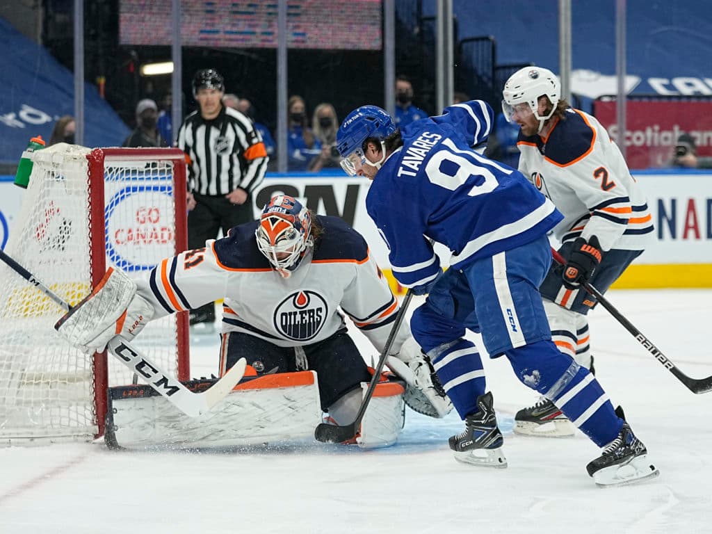 Jan 5, 2022; Toronto, Ontario, CAN; Toronto Maple Leafs forward John Tavares (91) scores on Edmonton Oilers goaltender Mike Smith (41) during the first period at Scotiabank Arena.