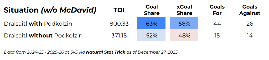 However, the value Podkolzin provides goes beyond just raw point totals. The easiest way to see this is by merely glancing at Draisaitl’s five-on-five results with and without Podkolzin at centre: