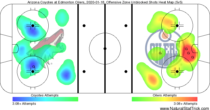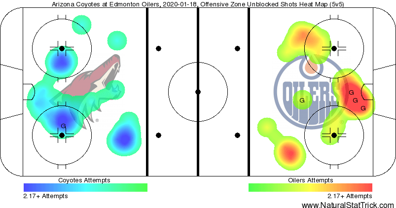 The Coyotes pulled the goalie with 5:00 left in the game, and put the Oilers on their heels momentarily before the Sheahan empty-net goal, forcing Mike Smith to make a High Danger save on @Vinnie Hinostroza at 3:22, followed by @Clayton Keller earning a good chance in the High Danger slot, but Smith remained solid.