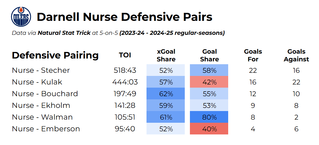 With all of that in mind in mind, it is obvious to me that Jake Walman deserves a much longer look next to Darnell Nurse. I believe it would be most optimal for the Oilers to start the 2025-26 season with this pairing and see what they can truly do. But if these results don’t hold over a large sample for whatever reason, perhaps it would be best to deploy Walman and Kulak as the second-pair, while Nurse and Stecher could be deployed as the third-pair.