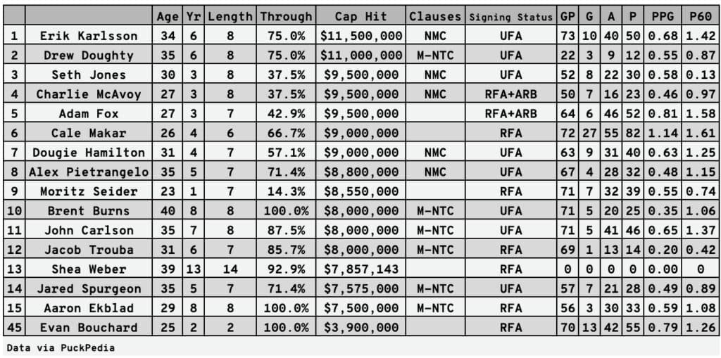 Time will tell what the final number will come in at for Bouchard, but there’s no denying his new deal will be massive. The list of the highest paid right-shot defencemen in the NHL is loaded with guys years into their deals.