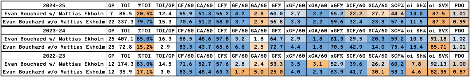 What we can see is that while Bouchard still posted strong numbers away from Ekholm over each of the last three playoffs at five-on-five, it was in a limited sample size. Expanding that sample size this year, and he continued to dominate with much more time spent without Ekholm. That, to me, constitutes a defensive breakout, as Bouchard would spent 151 minutes and 96 with Darnell Nurse.
