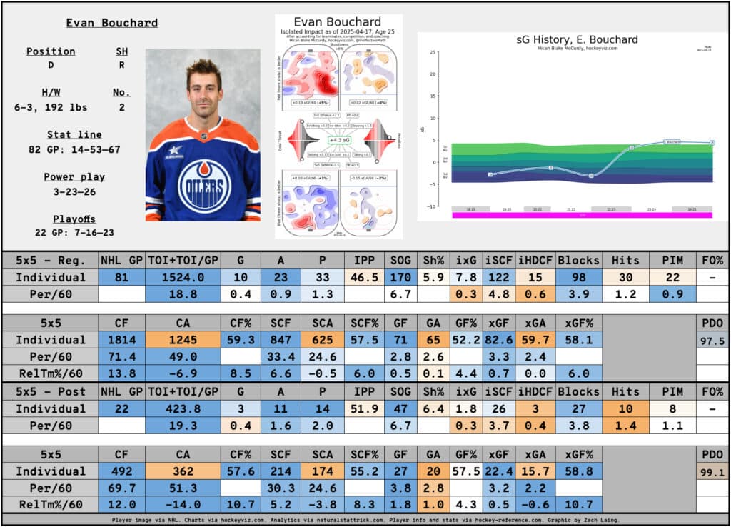For one, despite the dip, his numbers were still outstanding. The Oilers consistently controlled the pace of play with Bouchard on the ice, outscoring the opposition at a good clip in the regular season and an even better clip in the playoffs.