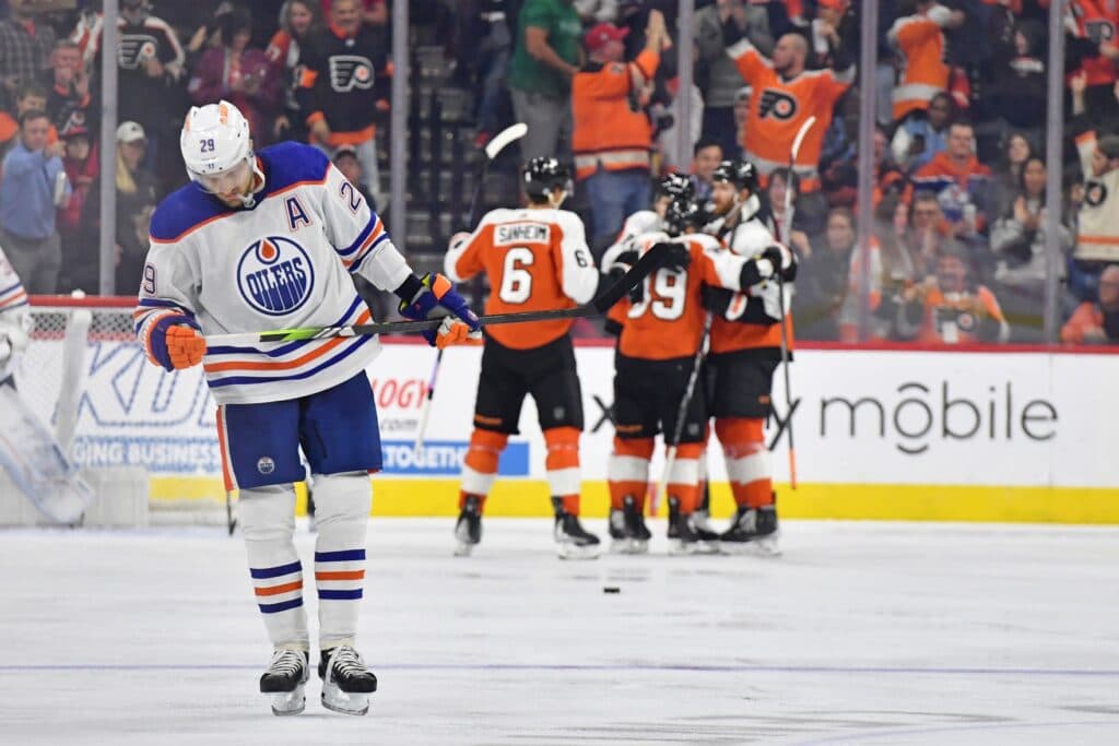 Oct 19, 2023; Philadelphia, Pennsylvania, USA; Edmonton Oilers center Leon Draisaitl (29) skates back to the bench as Philadelphia Flyers right wing Cam Atkinson (89) celebrates his goal with during the second period at Wells Fargo Center. Mandatory Credit: Eric Hartline-USA TODAY Sports