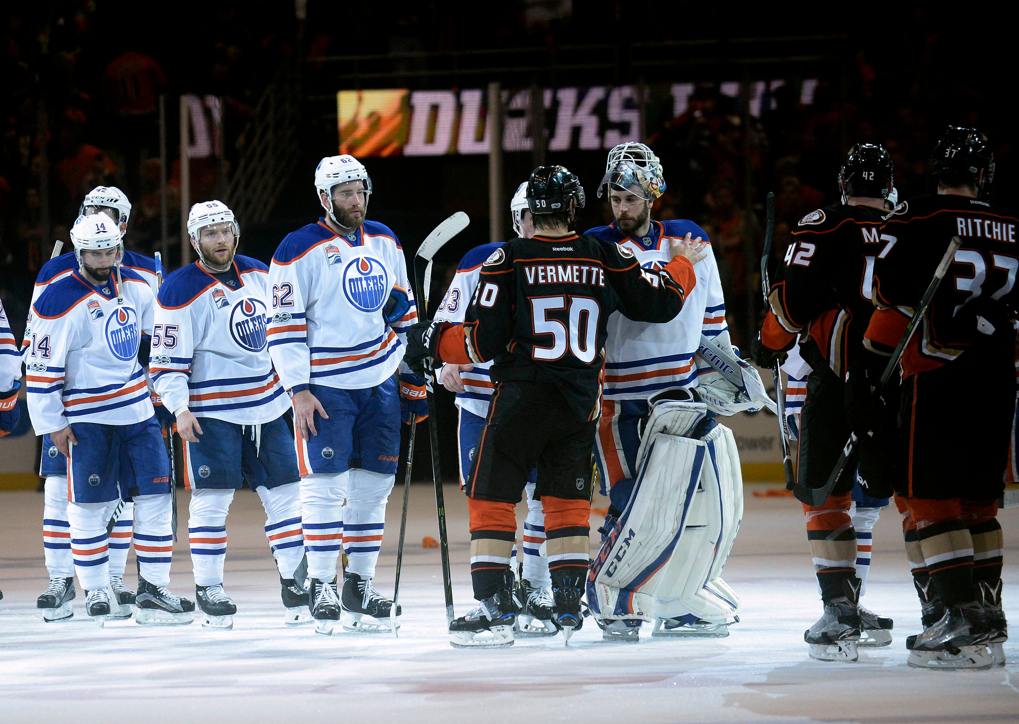 May 10, 2017; Anaheim, CA, USA; Anaheim Ducks center Antoine Vermette (50) meets with Edmonton Oilers goalie Cam Talbot (33) and players following the 2-1 victory and series win following game seven of the second round of the 2017 Stanley Cup Playoffs at Honda Center. Mandatory Credit: Gary A. Vasquez-USA TODAY Sports