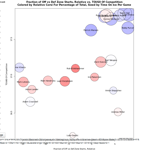 When things work out on a player, I think it is important to give credit. Back in 2014, Craig MacTavish was the GM and Matti Virmanen was pushing for the Finn. In year one, he was effective (in a very short time frame) with Anton Lander, and in year two he was effective with Lander. I think we can agree that Anton Lander was not the easiest fellow to play with this past season, but Pakarinen did pretty well in possession and even scored three goals in 152 minutes. Maybe it was all those Swedish speaking people in his home town growing up.