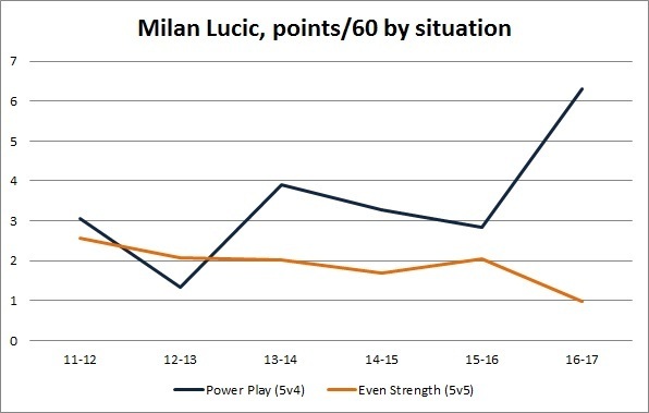 It isn’t news that Lucic has been essentially a power play specialist all season, or that this is out of character for him. His numbers this year are way out of whack with his career averages: