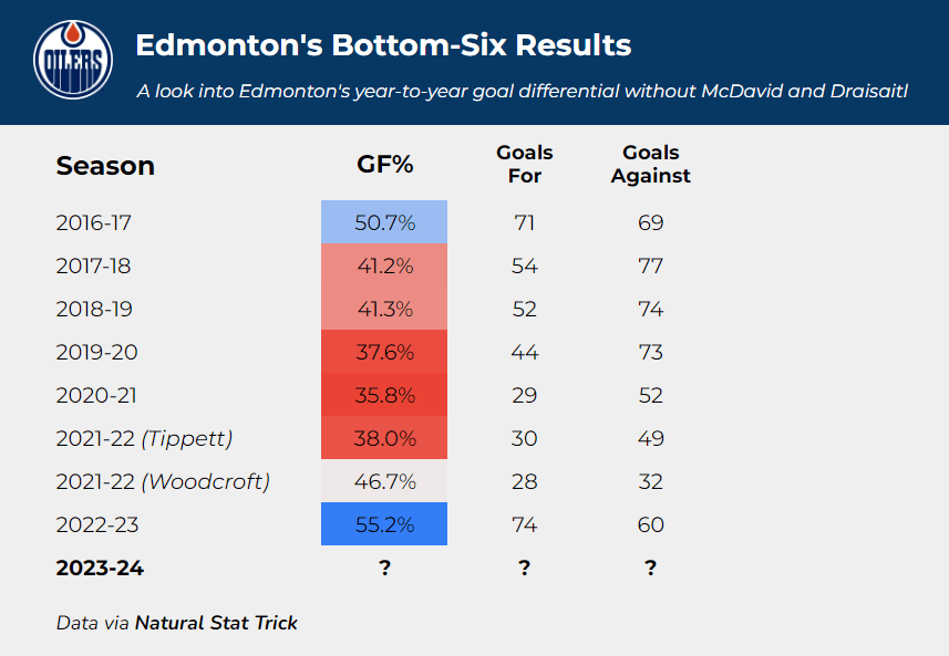 The rise of Edmonton’s bottom six was a major reason why the Oilers finally made the playoffs in 2016-17 after eleven straight seasons of missing the postseason. However, their depth was abysmal for quite some time after that season. Following Jay Woodcroft’s arrival in February of 2022, Edmonton’s bottom-six immediately improved by nearly 9 percent. In Woodcroft’s first full season behind the bench, the Oilers had a very strong 55 percent goal share without their two superstars on the ice.