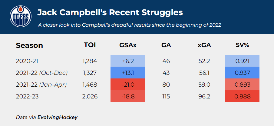 In a tight cap world, it’s difficult to win with players performing significantly below their cap hits. Campbell was signed to a $25M, five-year contract last July, but in his full season with the team, he allowed nearly a full 20 goals less than expected. Out of all Oilers goaltenders with at least 20 games played in the past fifteen years, Campbell had the lowest save percentage out of all of them in 2022-23, which includes some pretty awful goaltenders from the Decade Of Darkness.