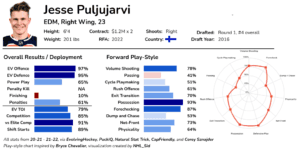 I think this is a nice time to demonstrate how underappreciated Puljujarvi can be. I recently made statistical visualizations for forwards and defencemen; here’s how Puljujarvi looks.