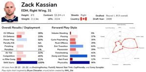 Kassian seldom shoots from high-quality locations, primarily plays a “dump and chase” style of game, doesn’t generate much offence off the rush, and is poor on the cycle. He’s an overall non-factor offensively, and quite poor defensively.