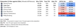 Ceci ranks 2nd on the team in DFF% against elite competition, just behind Broberg in a limited sample size. In this tough role, Ceci has certainly exceeded expectations so far.