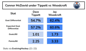 Of course, McDavid has always been the best player in the league, even under Tippett, but it’s incredible to see that he’s managed to find yet another gear under Woodcroft. Here’s a breakdown of his numbers.