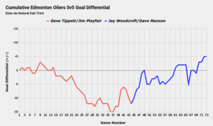 It’s indisputable that Dave Tippett and Jim Playfair were issues, as Edmonton was at a goal share of 46.8% (-12) under their direction.