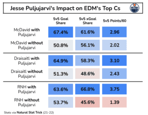 Here’s how each of Edmonton’s top centers performs, with and without Puljujarvi. With Puljujarvi on-ice, each of them considerably improves in regards to goal share, expected goal share, and even simple, traditional Points/60.