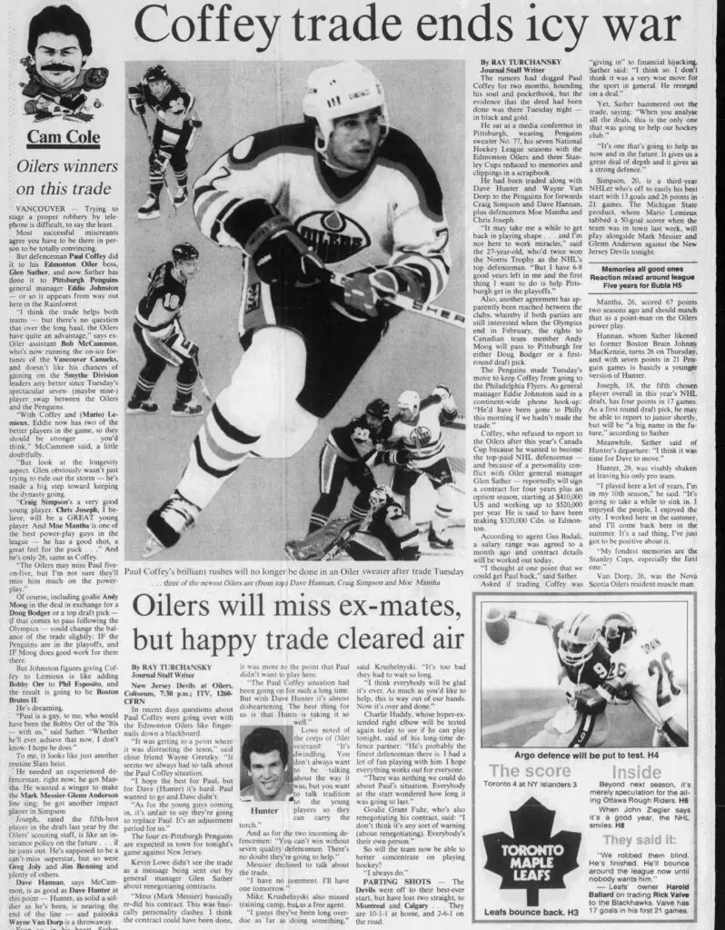 In late November of 1987, the Oilers would say goodbye to one of the greatest defencemen the franchise had ever witnessed. Craig Simpson, Moe Mantha, Chris Joseph, and Dave Hannan from the Pittsburgh Penguins would join the Oilers in exchange for Dave Hunter, Wayne Van Dorp, and, of course, Paul Coffey, for a total of seven players involved in the deal.