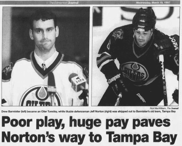 This trade is actually part of the Wayne Gretzky trade tree, as the Oilers acquired Norton for Igor Kravchuk, a defenceman who came back from the Chicago Blackhawks along with Dean McAmmond in exchange for Joe Murphy. The Oilers acquired Murphy a few years earlier from the Detroit Red Wings in a deal for Jimmy Carson, who was the best player Edmonton got back from the L.A. Kings for Gretzky.