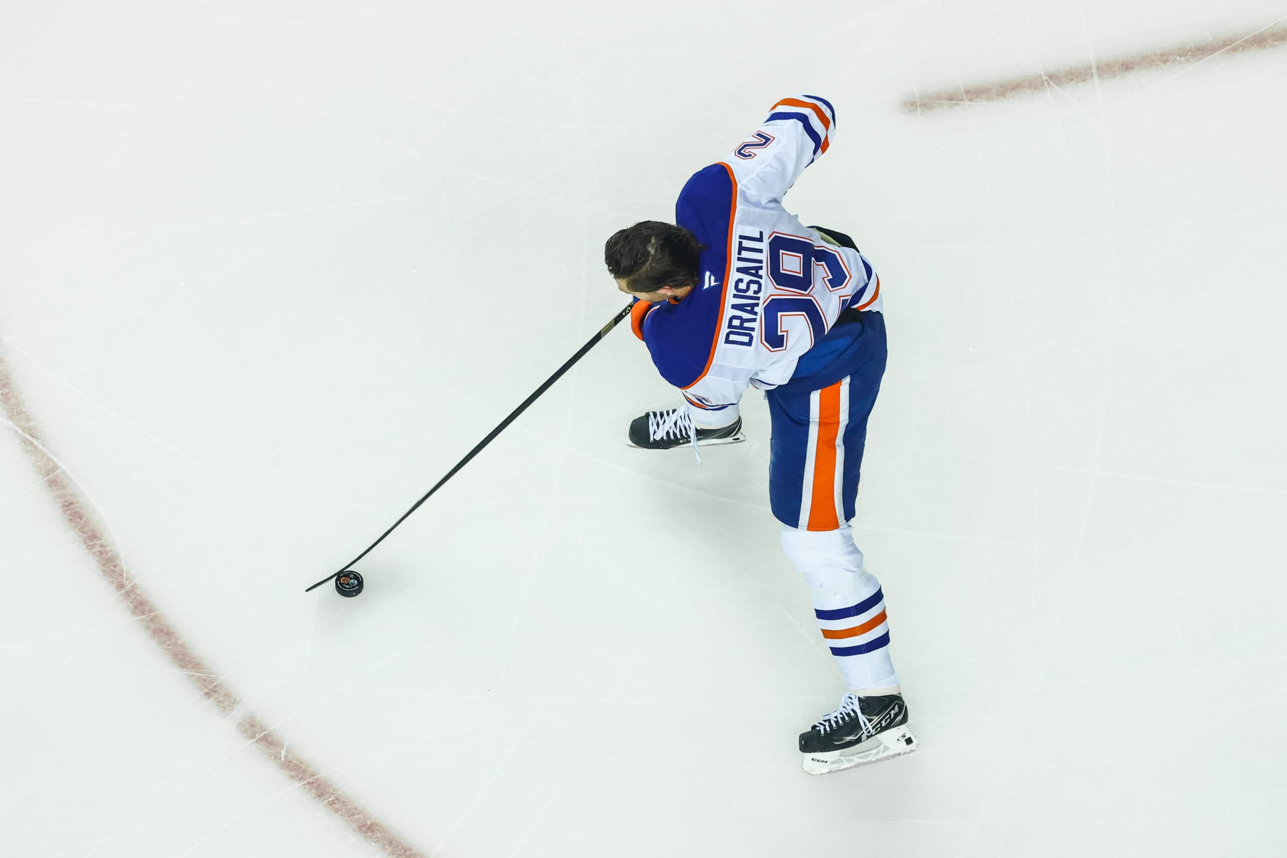 Feb 4, 2026; Calgary, Alberta, CAN; Edmonton Oilers center Leon Draisaitl (29) skates with the puck during the warmup period against the Calgary Flames at Scotiabank Saddledome. Mandatory Credit: Sergei Belski-Imagn Images