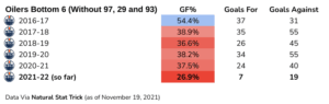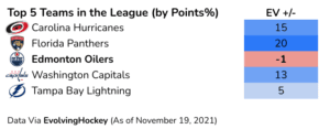 Edmonton’s most significant concern so far should be their even-strength play. They’re currently 3rd in the league in Points%, but in terms of even-strength goal differential, they’re -1.