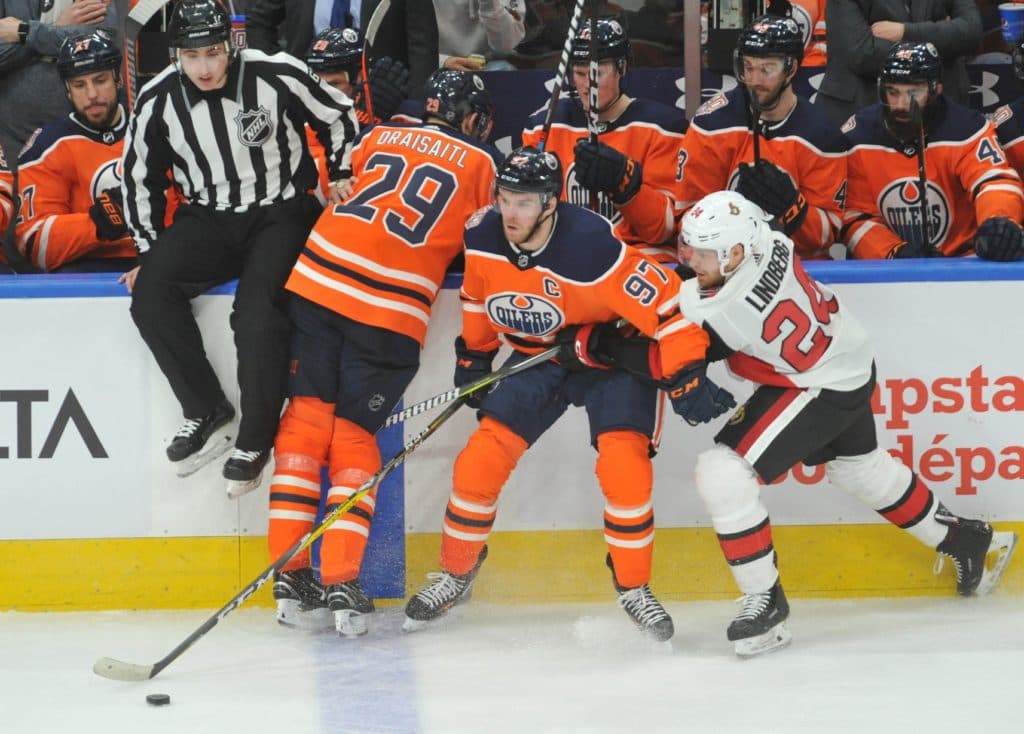 Mar 23, 2019; Edmonton, Alberta, CAN; Edmonton Oilers center Connor McDavid (97) battles for the puck with Ottawa Senators left winger Oscar Lindberg (24) during the second period of NHL game action at Rogers Place. Mandatory Credit: Walter Tychnowicz-USA TODAY Sports